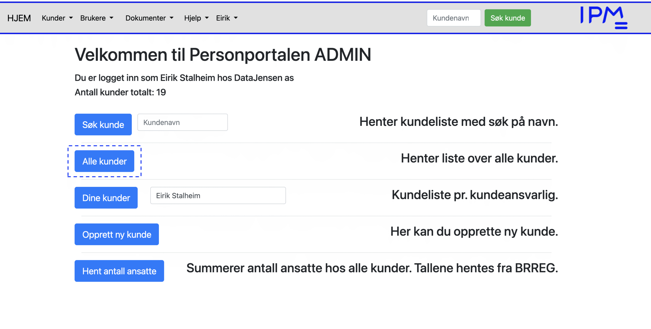 Her har man direkte tilgang på alle funksjoner som har med kunder å gjøre. De samme funksjonene ligger også under menyen «Kunder» øverst i skjermbildet. Menyene «Brukere» og «Dokumenter», samt knappen «Hent antall ansatte» er bare tilgjengelig for admin brukere.