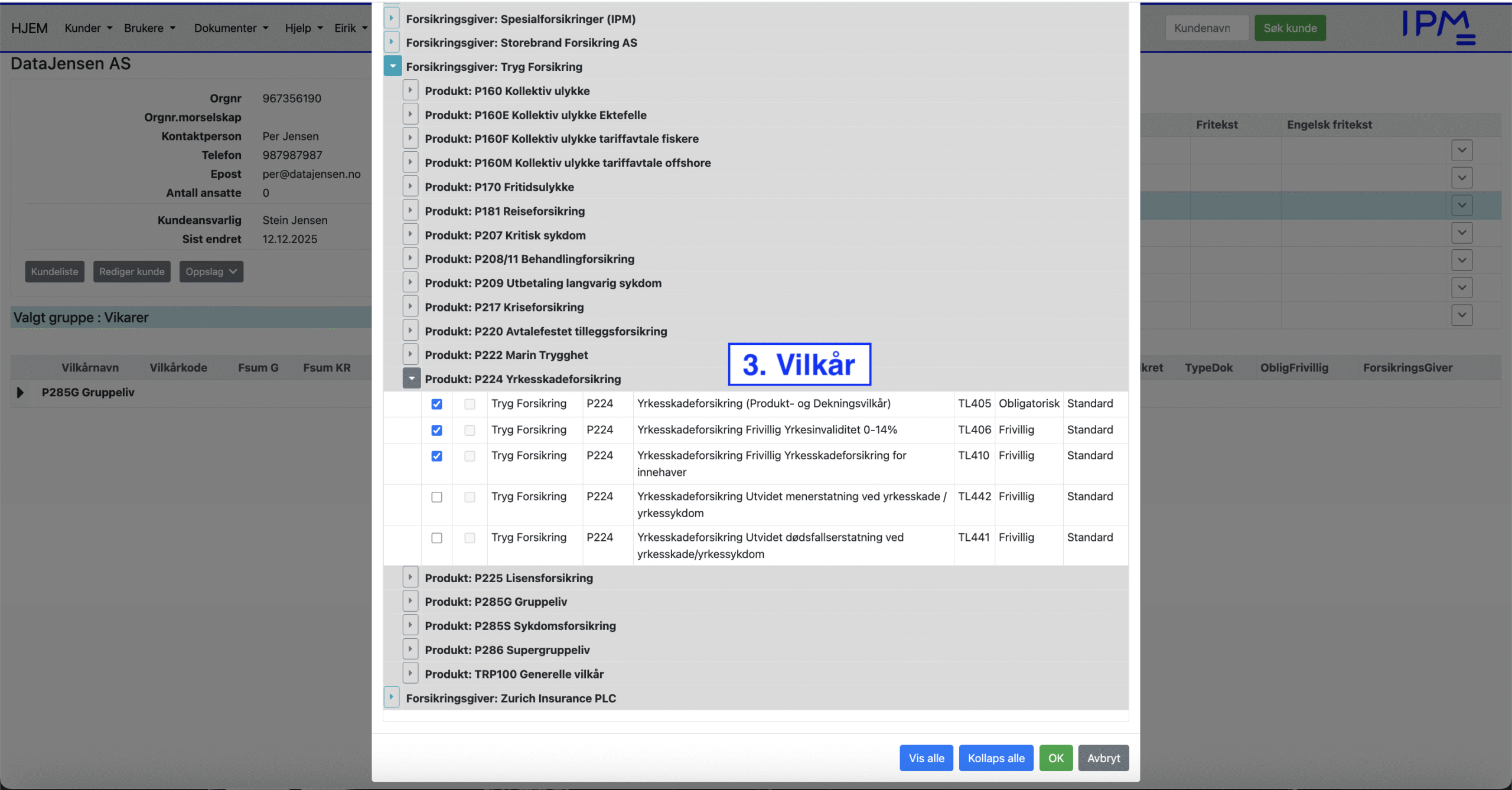 En ny dialogboks for valg av vilkår åpnes. Se eksempler under. Her åpnes først produkt-/vilkårssett for den forsikringsgiveren som det er aktuelt å bruke. Her vises først alle forsikringsgiverne man har tilgang på. Når man klikker på knappen til venstre på en forsikringsgiver vises alle produktene som hører til denne forsikringsgiveren. Ved å klikke på knappen til venstre på et produkt får man opp alle vilkårene som hører til produktet.
