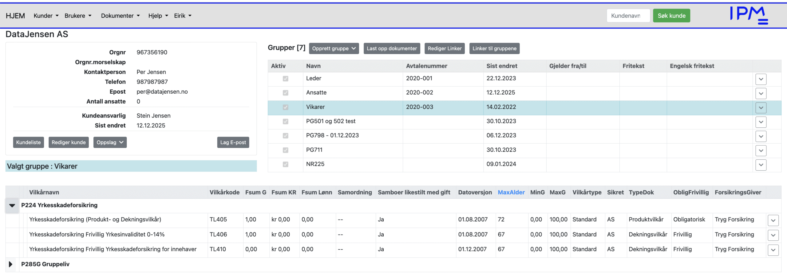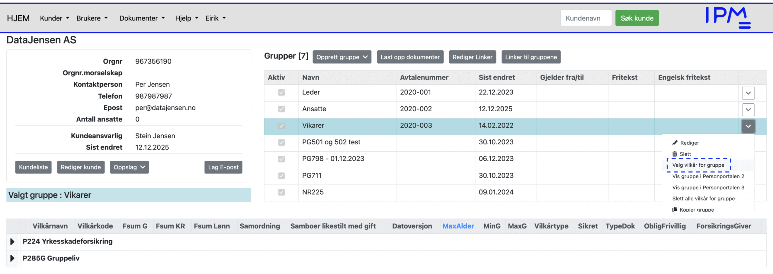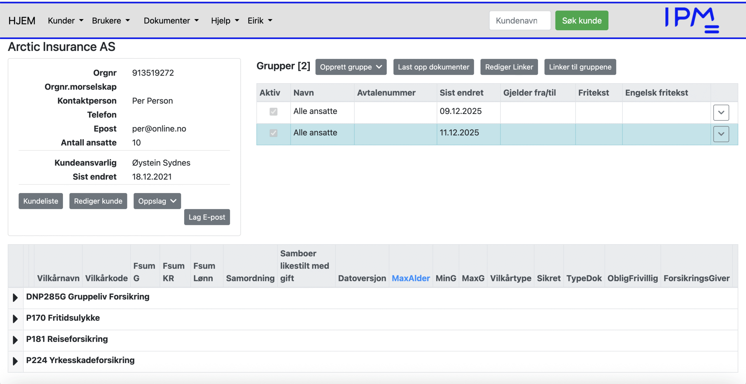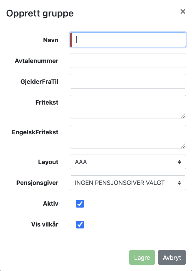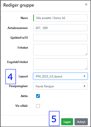 Denne dialogboksen gir deg mulighet til å legge inn et navn, avtalenummer, fritekster på engelsk og norsk (til bruk i forsikringsbevis), aktivere – deaktivere gruppen og velge logo. Dialogboksen gir deg også muligheter for å bestemme om forsikringsgivers vilkår skal vises eller ikke. Feltet, «Avtalenummer», kan inneholde et eller flere avtalenummer. Ved hjelp av Layout nedtrekksmenyen velges hvilken logo som skal brukes for den aktuelle gruppen. For å tilordne forskjellige logovalg til gruppen må IPM kontaktes. Navnet på gruppen brukes sammen med kundenavnet for å identifisere Personportalen for kunden. Dette vil komme frem i headingen på Personportalen.