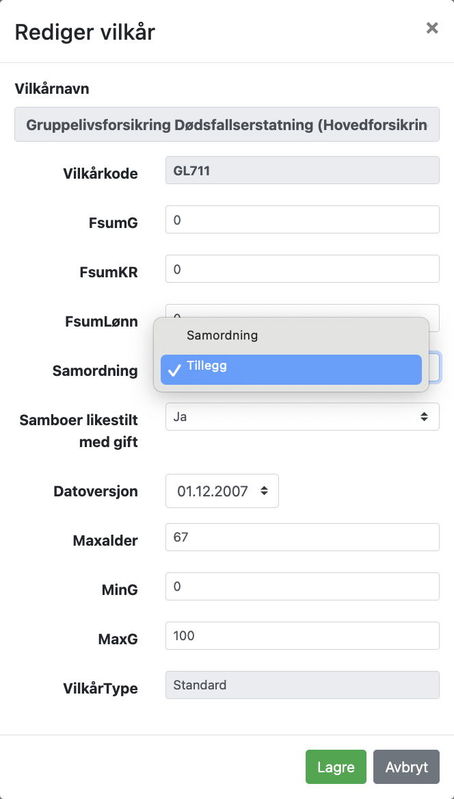 Du kommer deretter tilbake til hovedbildet, der du nå kan endre erstatningssummer, om man skal ha samordning i stedet for tilleggsløsning, andre vilkårsversjoner enn det som er standard («Datoversjon»), trapping på gruppeliv, lønnsbasert dekning på gruppeliv og evt. vilkårs verdioverstyring.
