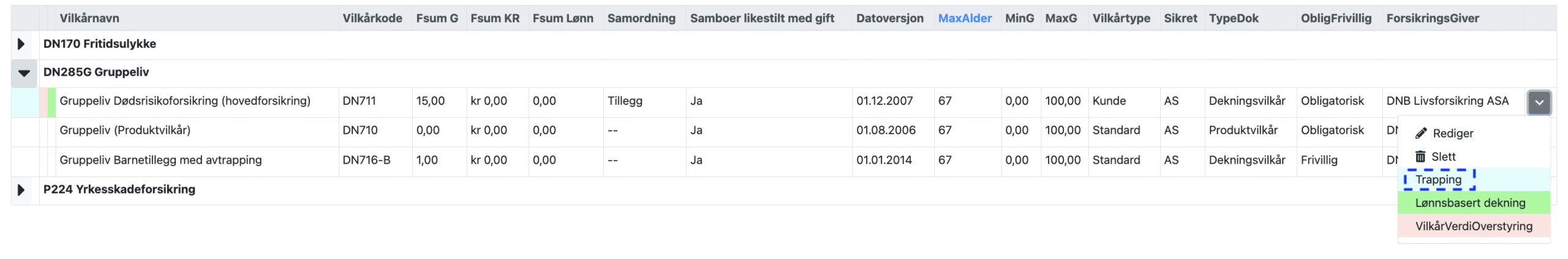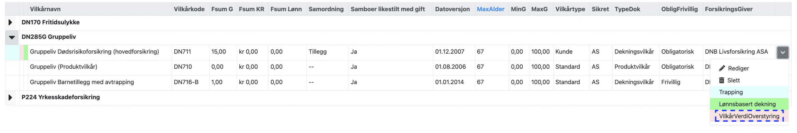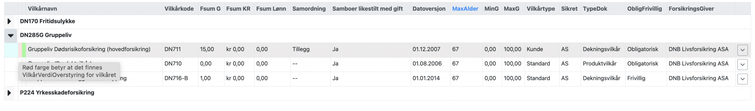 Rød farge i linjen for vilkåret for Gruppeliv Dødsrisikoforsikring (hovedforsikring). Den røde fargen betyr at det finnes VilkårsVerdiOverstyring for vilkåret.