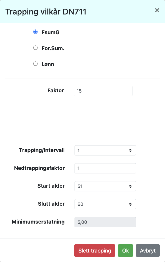 Her velger man om erstatningen skal være i G, i kroner eller i forhold til lønn (de tre øverste knappene). Deretter setter faktor (starten på trappen), trappeintervall, nedtrappingsfaktor per trappeintervall, startalder på trappen og sluttalder på trappen. Systemet beregner selv minimumserstatning som angis i siste boksen. Når ønskede data er lagt inn trykker man OK og vender tilbake til hovedbildet. Etter at man har trykket ok må eventuelle endringer i erstatning foregå i dialogboksen over.