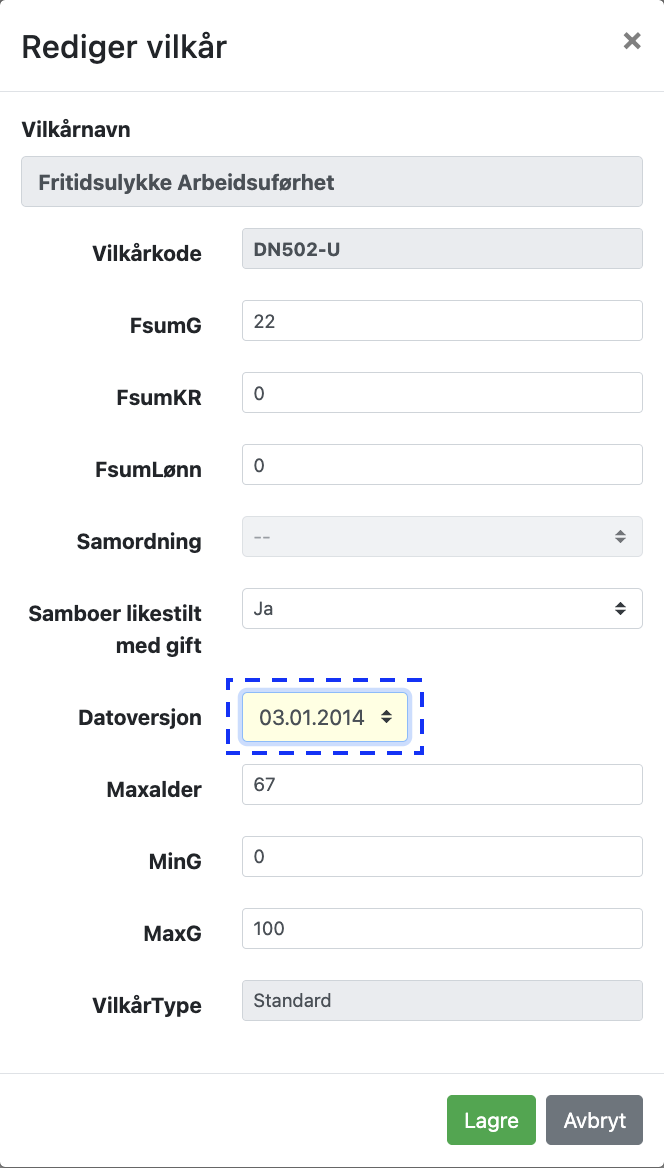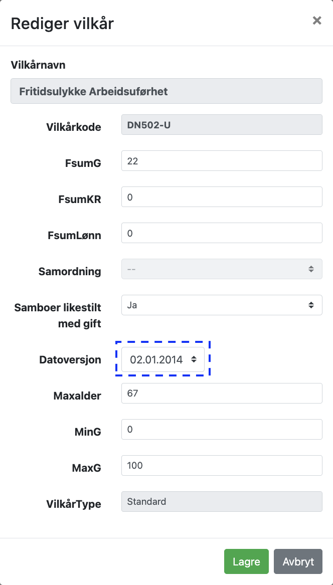 Marker linjen med det aktuelle vilkåret / dekningen og klikk på feltet under kolonnen «DatoVersjon».