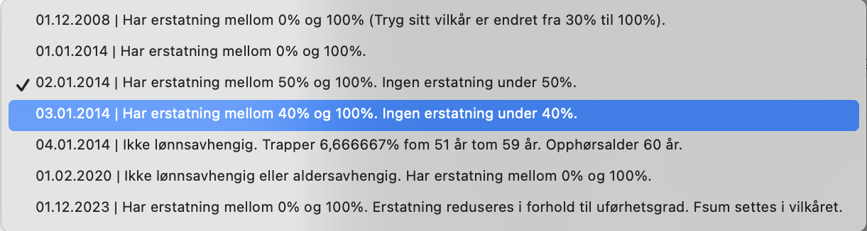 Undervarianter av vilkåret vises i ny dialogboks. Standard vilkår / dekning hos den aktuelle forsikringsgiver vil være default «DatoVersjon». Andre vilkår og dekninger, som har egenskaper som avviker fra standardvilkåret, fremkommer som «DatoVersjoner».