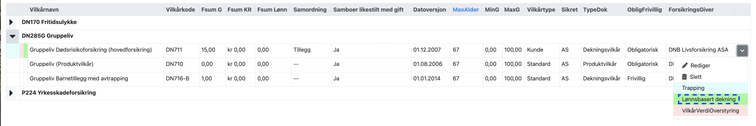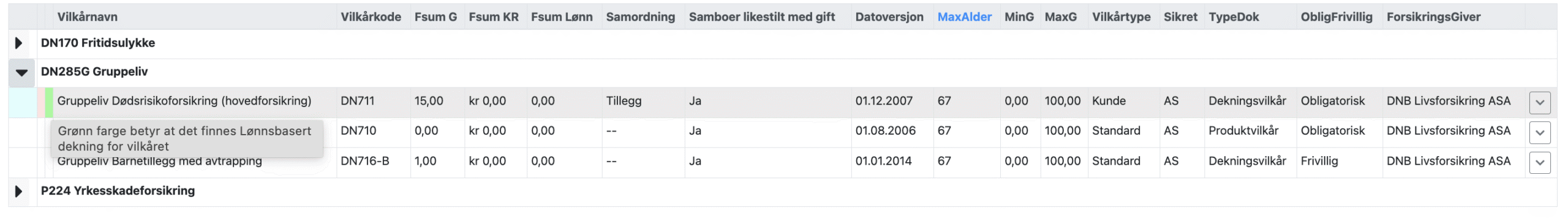 Grønn farge i linjen for vilkåret for Gruppeliv Dødsrisikoforsikring (hovedforsikring). Den grønne fargen betyr at grunnerstatningen i vilkåret også er lønnsbasert