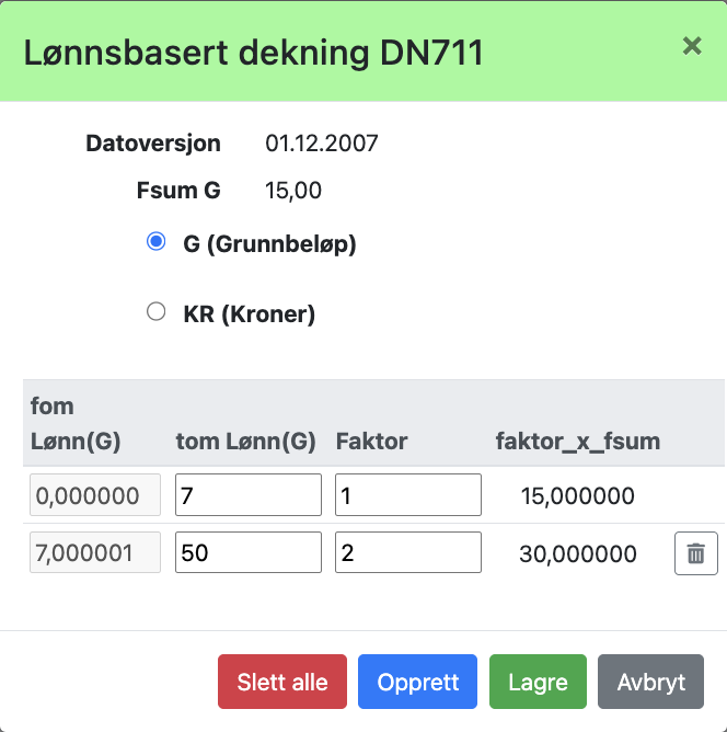 I eksemplet er det fra før valgt en forsikringssum på 15 G (grunnerstatning). Trykk på knappen «Opprett» og definer fra og med og til og med lønn (0 G til 7 G) og erstatningsfaktor som skal gjelde (dvs. 1). Dette gir 15 G i erstatning for dette lønnsintervallet. I tillegg har vi opprettet et intervall nr. to fra 7 til 50 G med faktor 2, som gir 30 G i erstatning for dette intervallet. Trykk deretter «Lagre» og man går tilbake til hovedbildet.