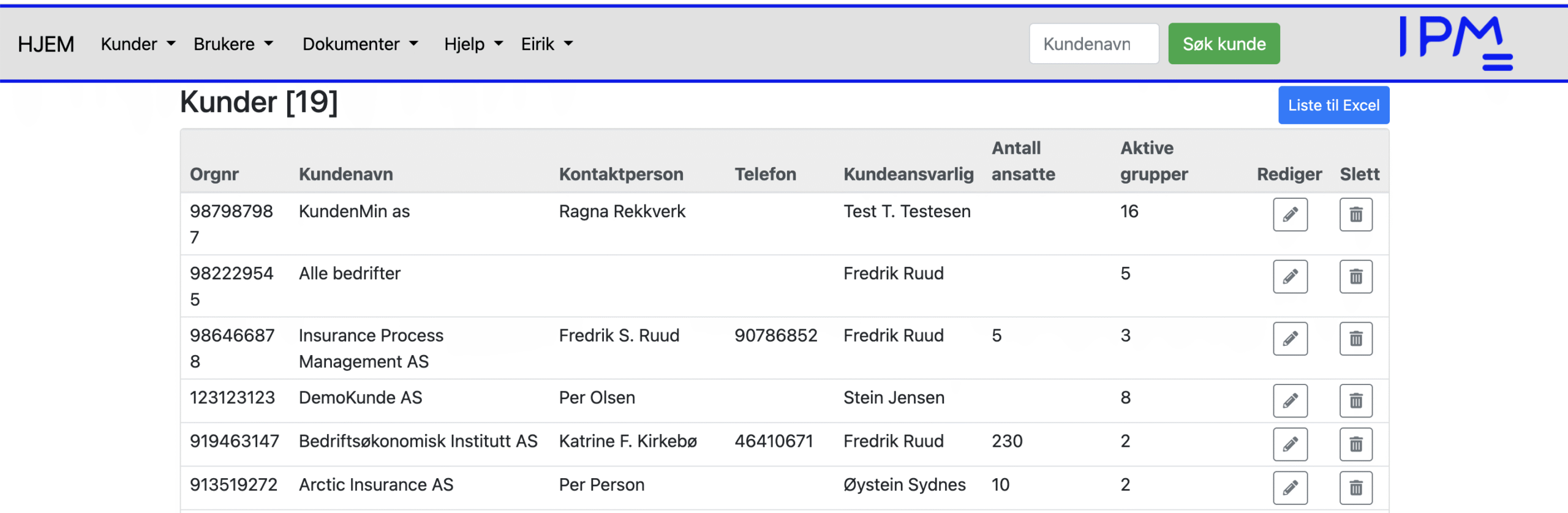 Når man klikker på knappen «Alle kunder» får man opp en oversikt over alle kundene.