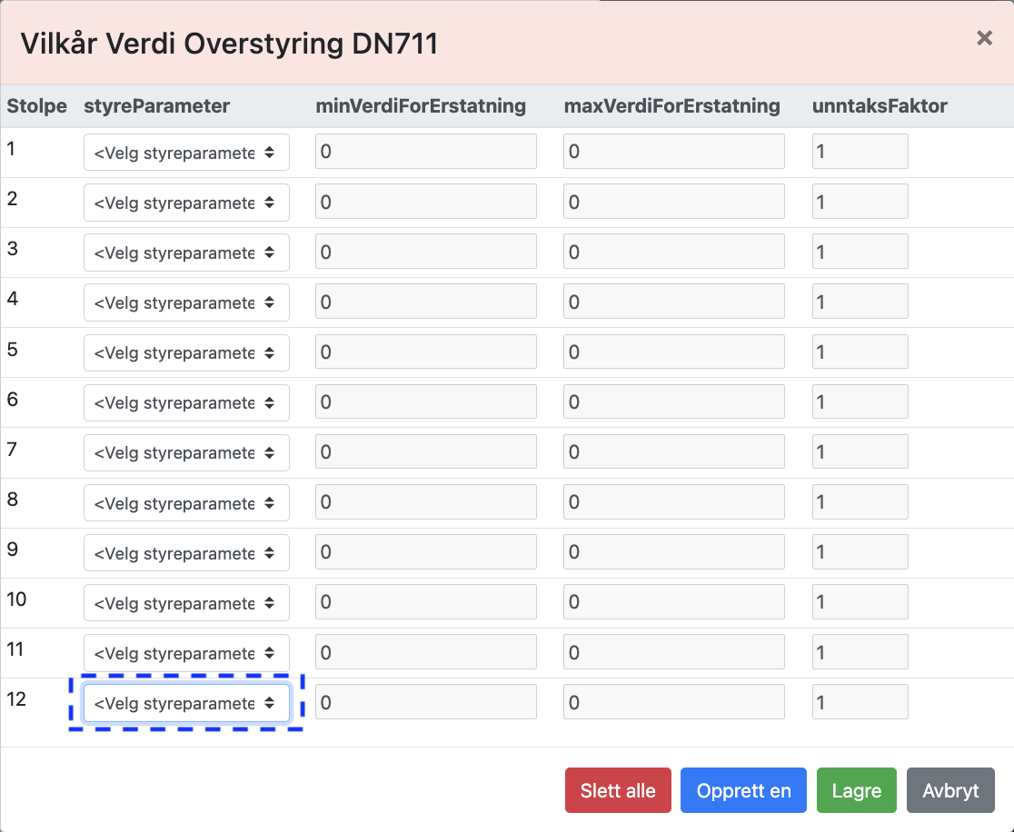 De 12 erstatningstallene er referert til som «Stolpe» i første kolonne. Hvert av de 12 erstatningstallene kan endres med tanke på erstatningsregler eller såkalte «styreparametere»