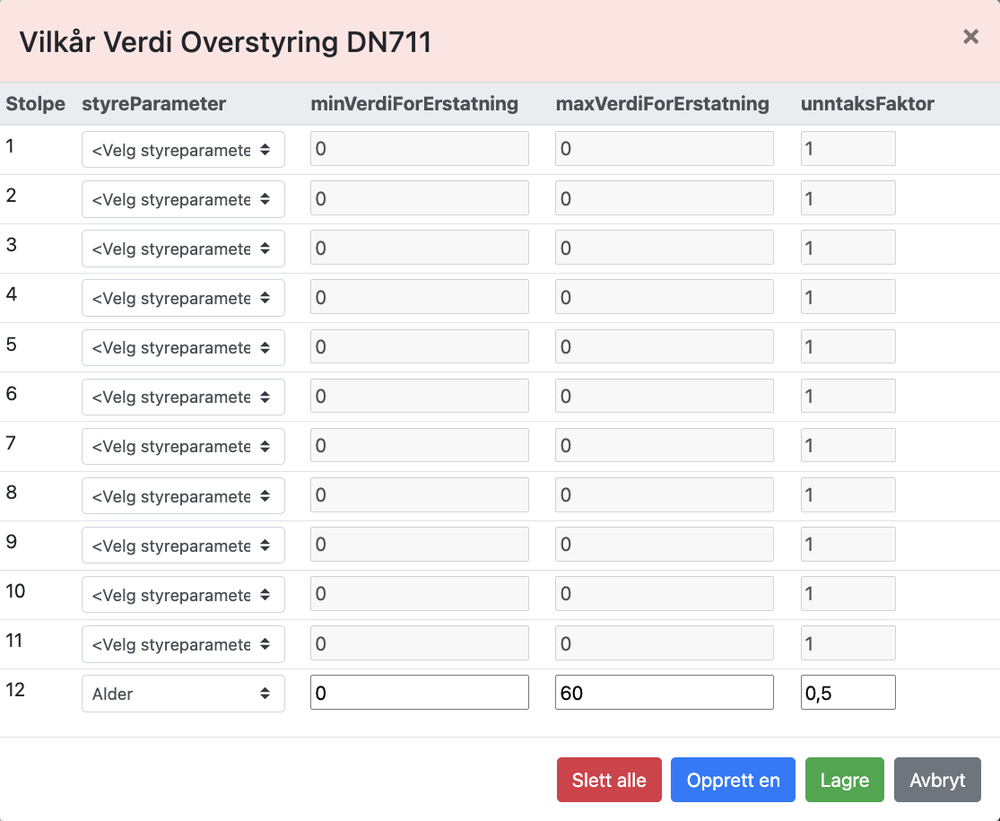 I kolonnen for «minVerdiForErstatning» setter vi 0 (null), i kolonnen for maxVerdiForErstatning» settes 60 og i kolonnen for «unntaksFaktor» setter vi 0,5.