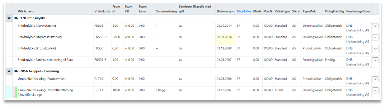 Gul farge i linjen for fritidsulykke, men og påførte utgifter (skade som ikke medfører død) under kolonnen for DatoVersjon. Den gule fargen forteller at det er valgt et annet vilkår enn default (standard) vilkåret for denne dekningen.