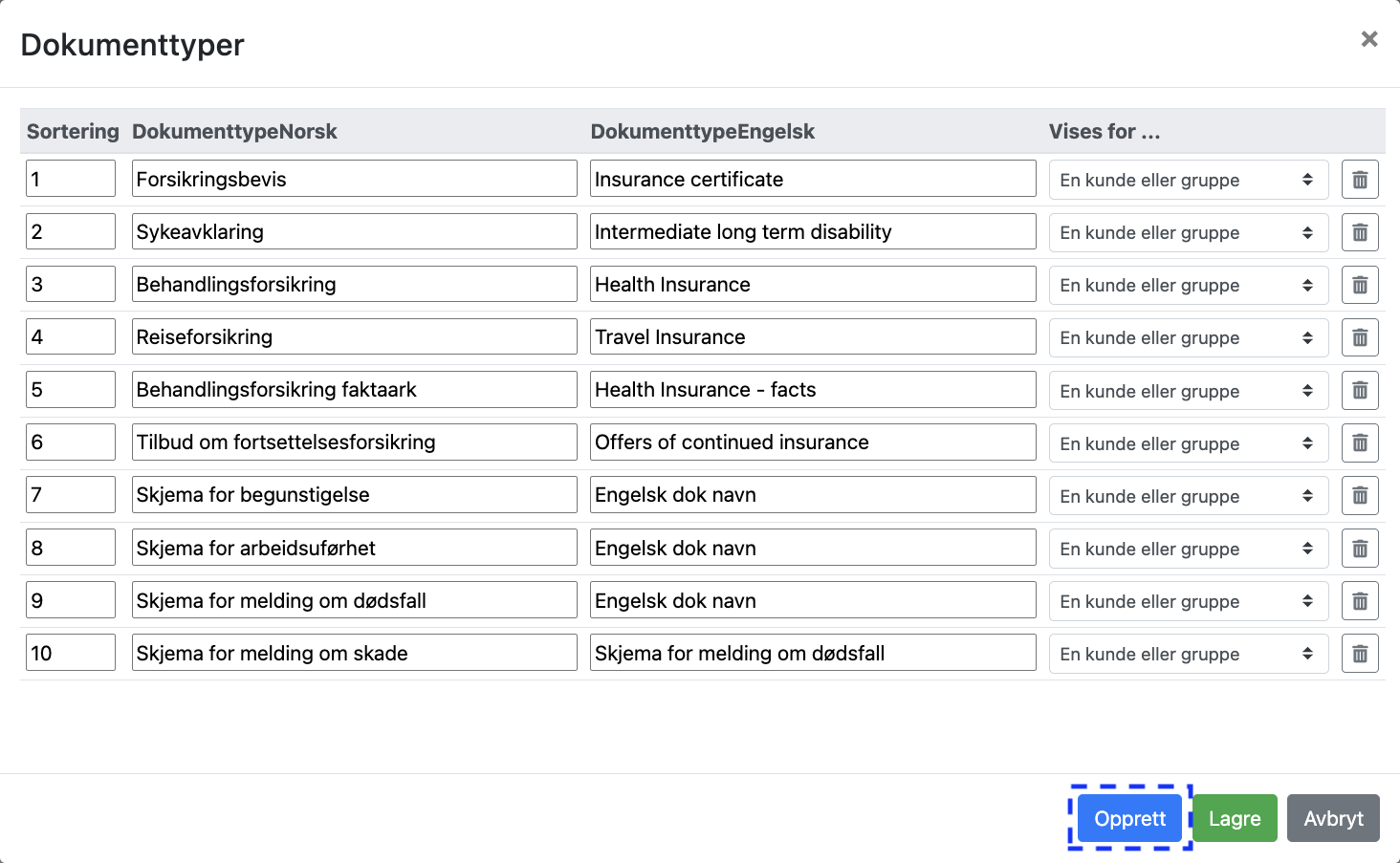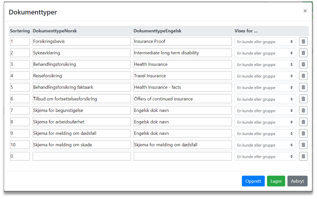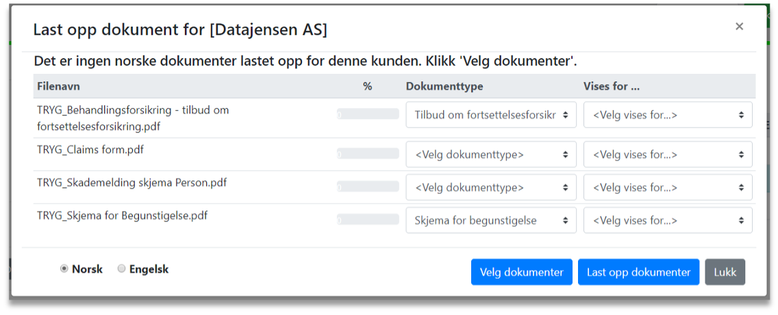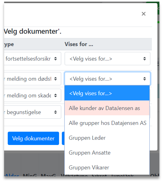 Når man har navngitt dokumentet velges deretter om dette skal vises for en bestemt kunde eller gruppe eller for alle aktive kunder forsikringsmegleren / forsikringsgiveren har lagt inn i Personportalen.