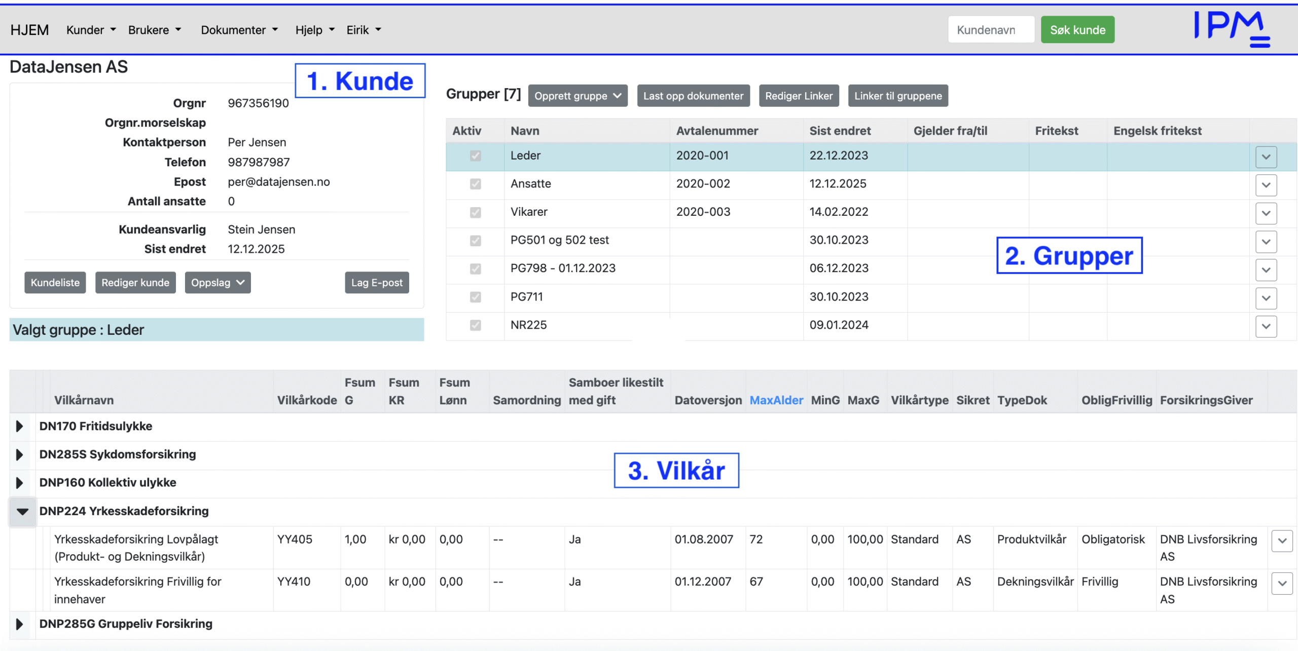 Gruppen med identiske vilkår fra den eksisterende kunden (Insurance AS) er nå kopiert inn på den nye kunden du har etablert.