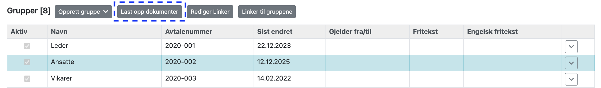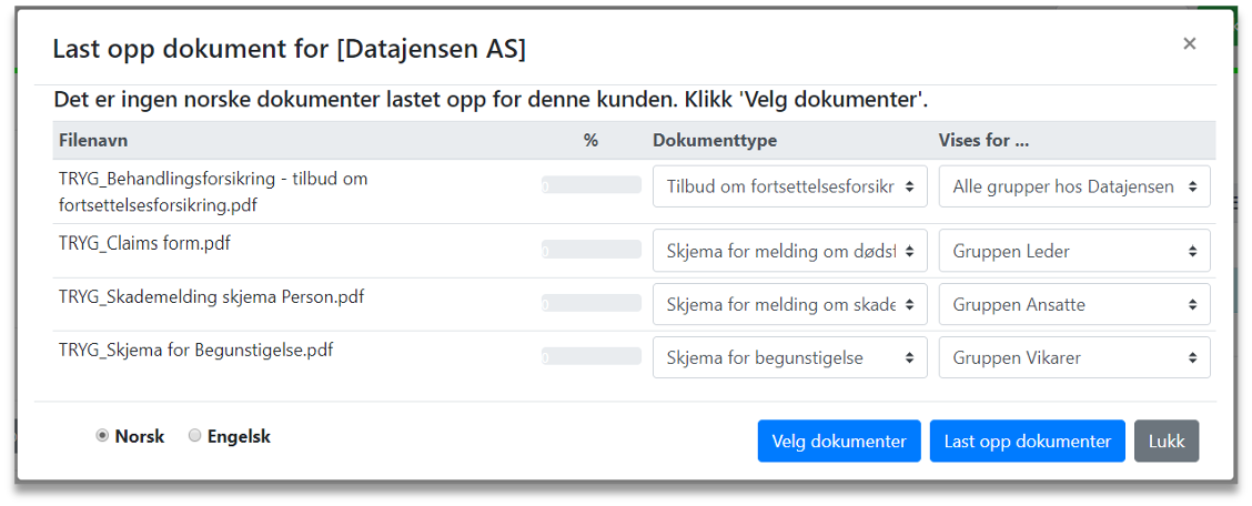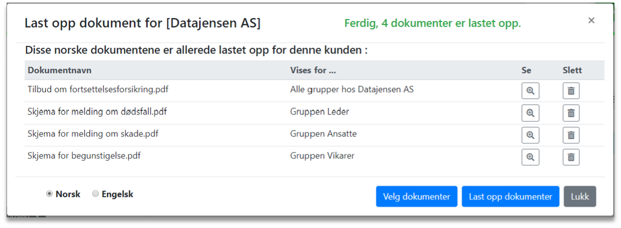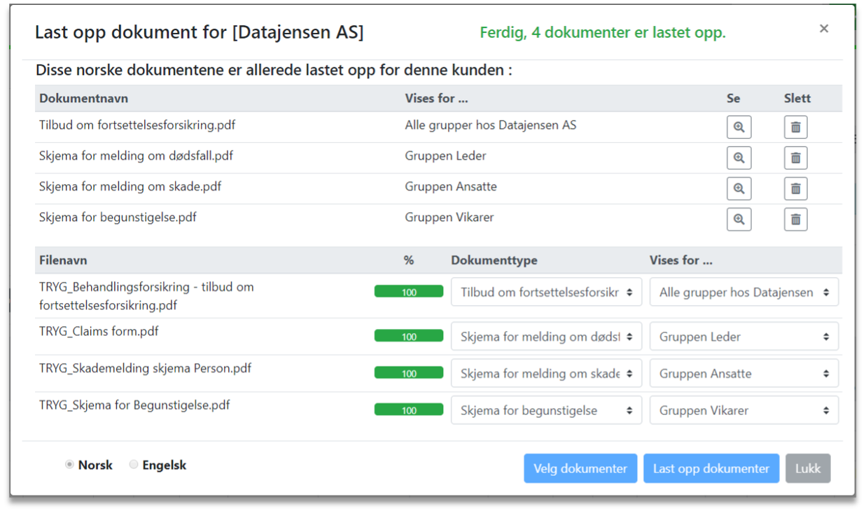 6. Laste opp dokumenter for en gruppe, alle grupper hos en kunde eller alle kunder