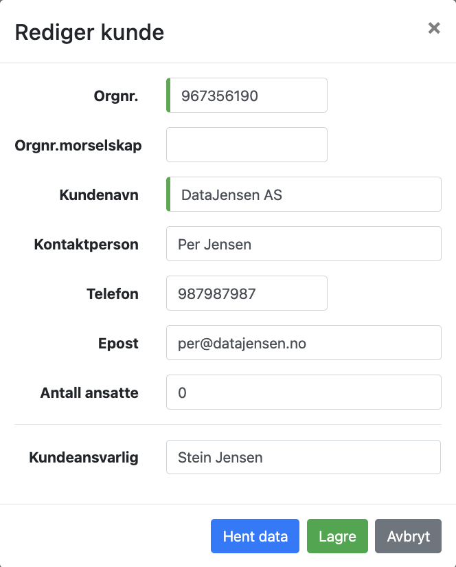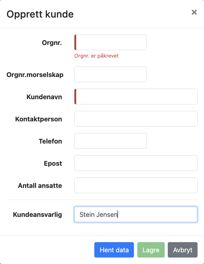 Kundeansvarlig legges inn for å holde orden på sine egne kunder. Organisasjonsnummer må være unikt slik at det bare kan eksistere en kunde med dette nummeret i systemet. Vi anbefaler å legge inn øvrige informasjon med kontaktperson, telefon og e-post. Dette for å kunne kommunisere med kontaktperson hos kunde senere på en effektiv måte.