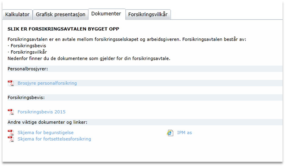 Dokumenter som starter med «Brosjyre» / «Brochure» eller ordene «Forsikringsbevis» / «Insurance certificate» legges innunder arkfanen «Dokumenter» / «Documents» og overskriftene «Personalbrosjyrer» / «Personnel brochures» og «Forsikringsbevis» / «Insurance certificate» i alfanumerisk rekkefølge.
