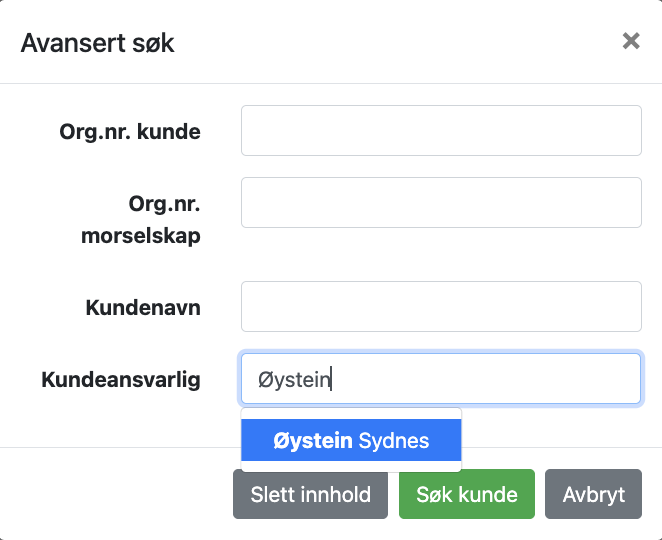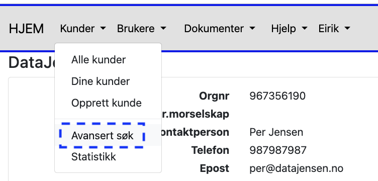 Ved å klikke på nedtrekksmenyen “Kunder” øverst i menyfanen og deretter alternativet “Avansert søk”, får man opp en ny “Avansert søk” dialogboks. Her kan man skrive inn starten på et kundenavn og deretter på “Søk kunde” knappen (man kan også søke på de andre søkekriteriene i boksene over).