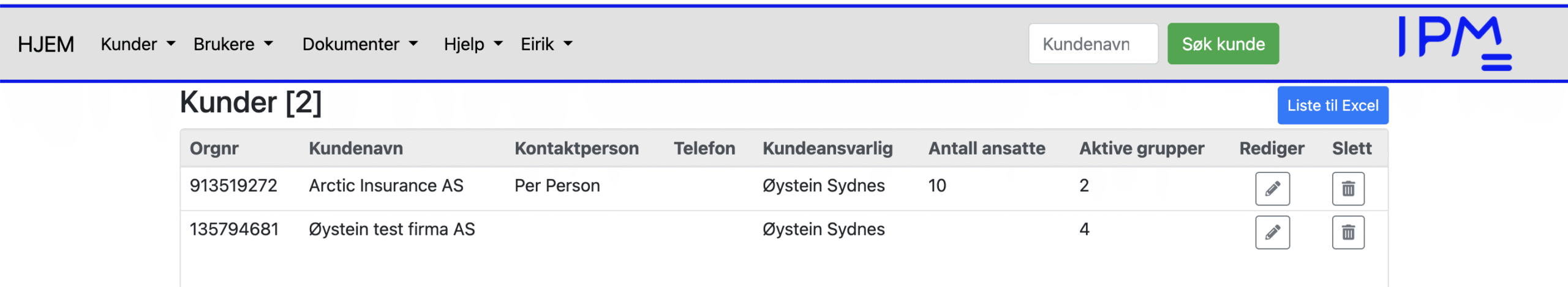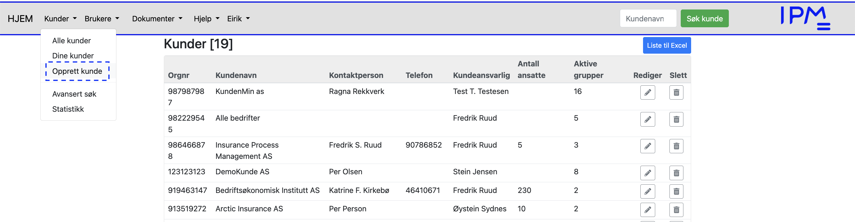 Her kan man slette en kunder ved å klikke på «Slett» knappen ytterst til høyre. Det er ikke mulig å slette kunder som er nyttet til grupper. Da må gruppene slettes først.