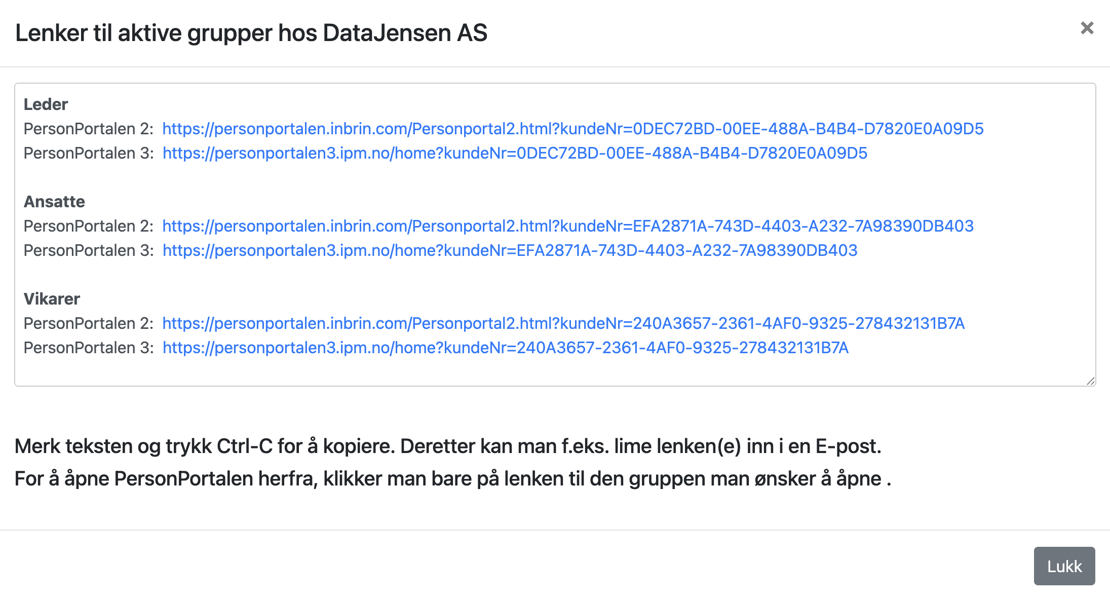 Knappen «Linker til gruppene» gir deg en dialogboks der du kan komme direkte over til PersonPortalen for en kunde / gruppe du arbeider med, eller du kan klippe og lime kundeinformasjonen inn i for eksempel en mail til kunden.