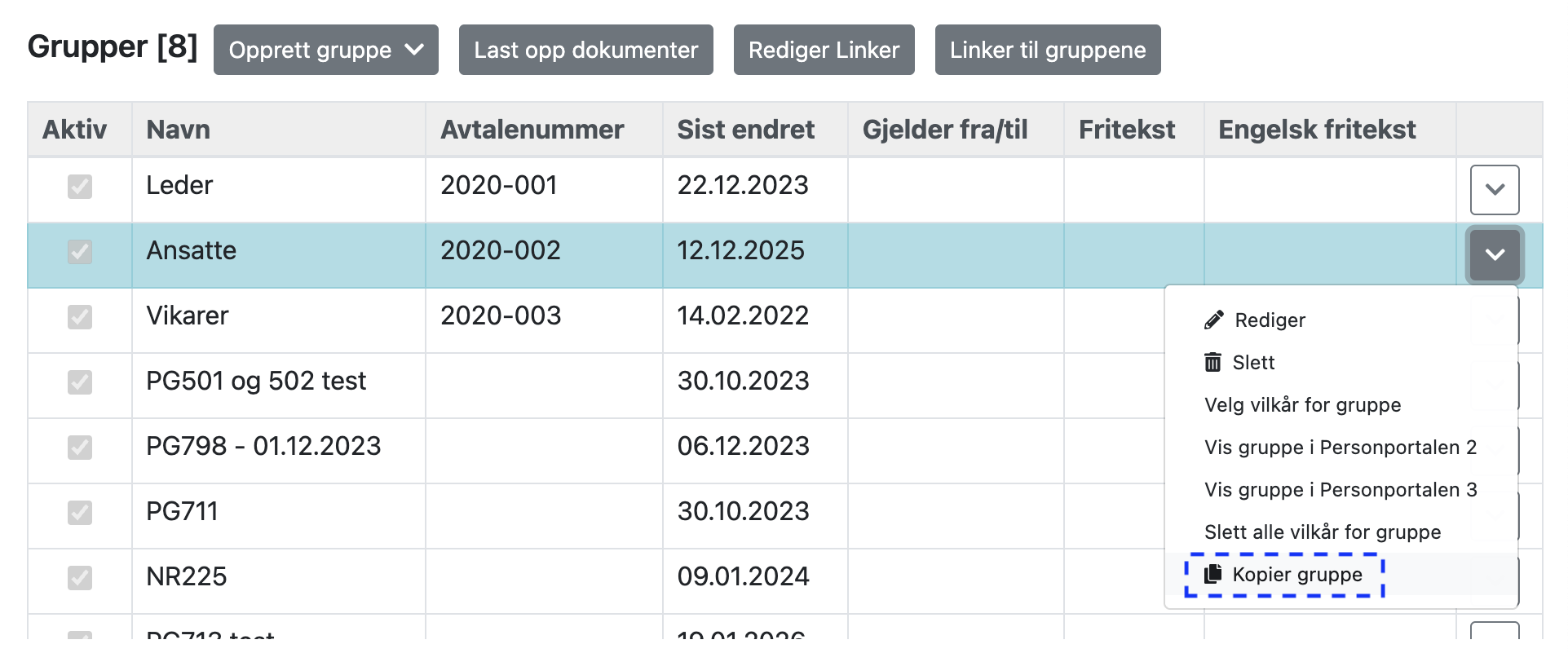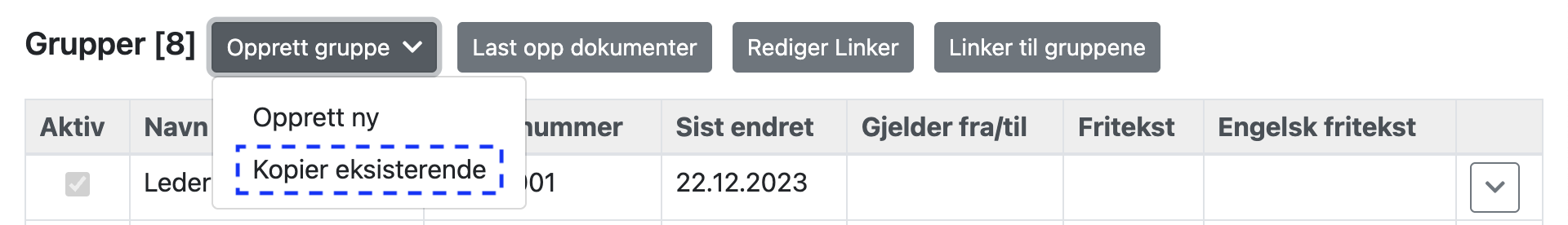 Merk linjen for gruppen, trykk på knappen ytterst til høyre og velg «Kopier gruppe».