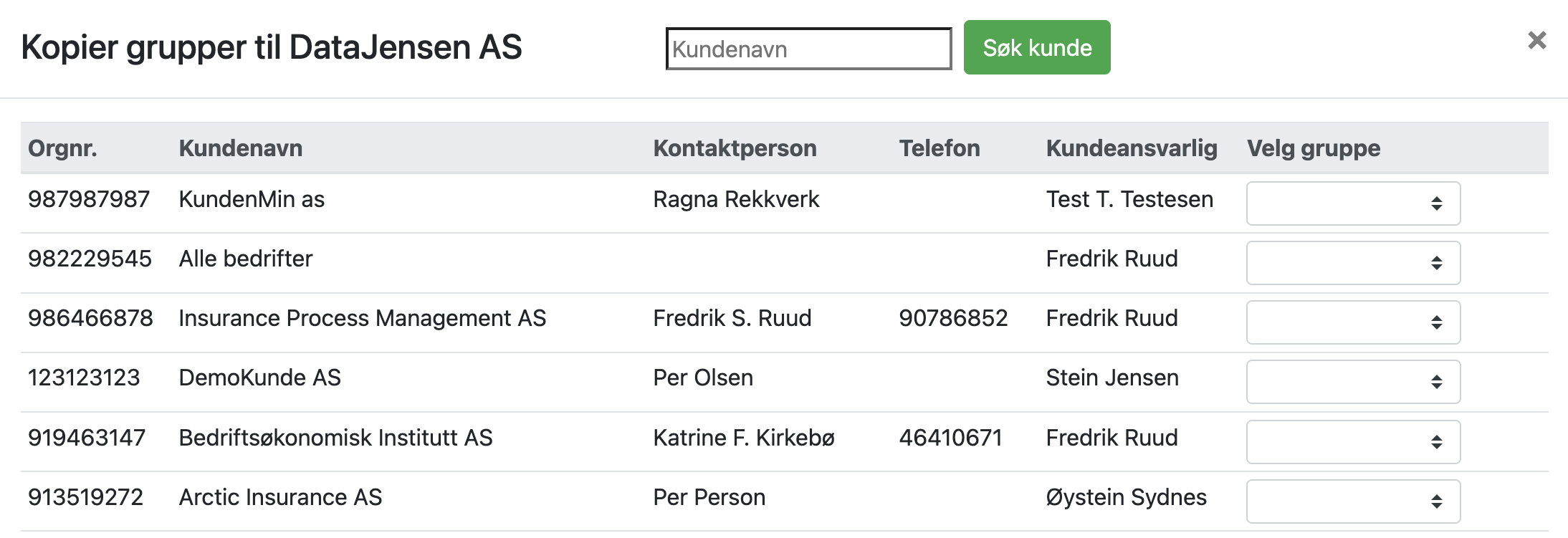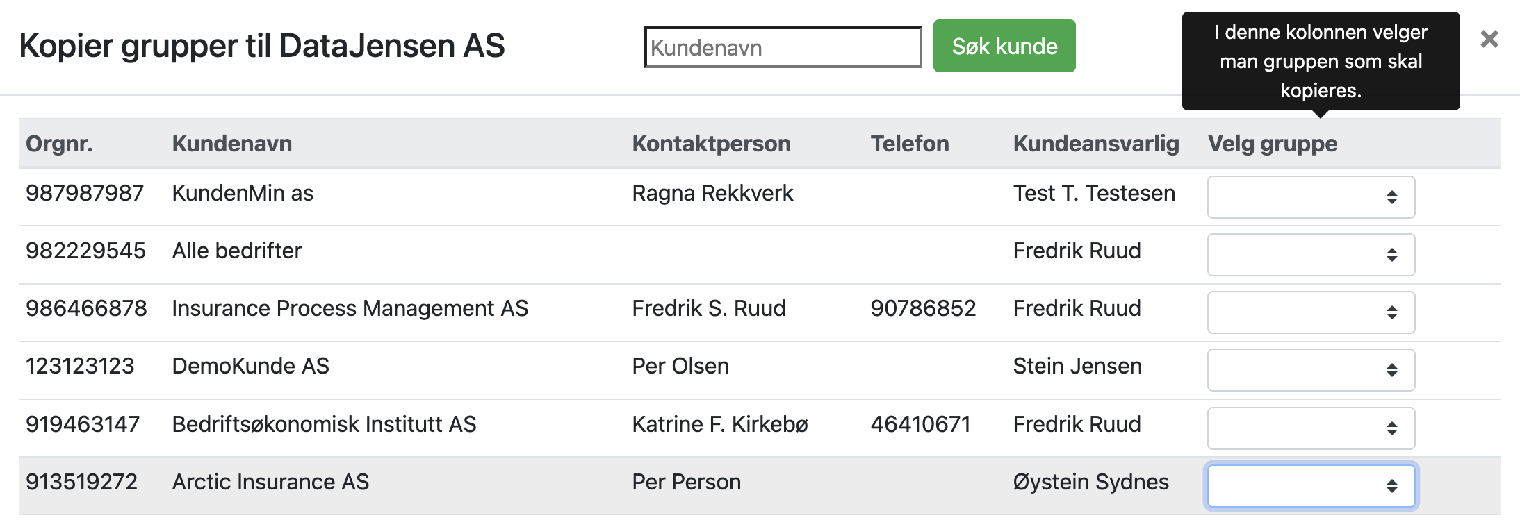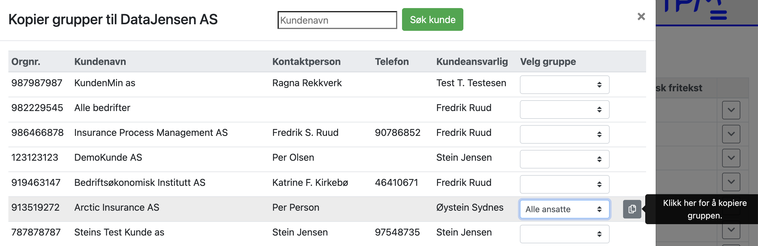 Velg kunden man skal kopiere gruppen fra: